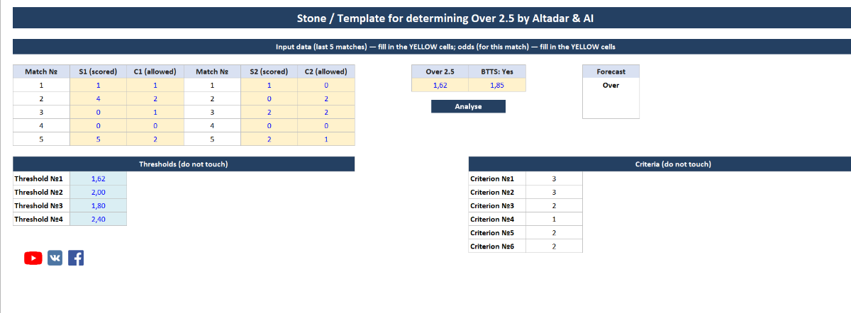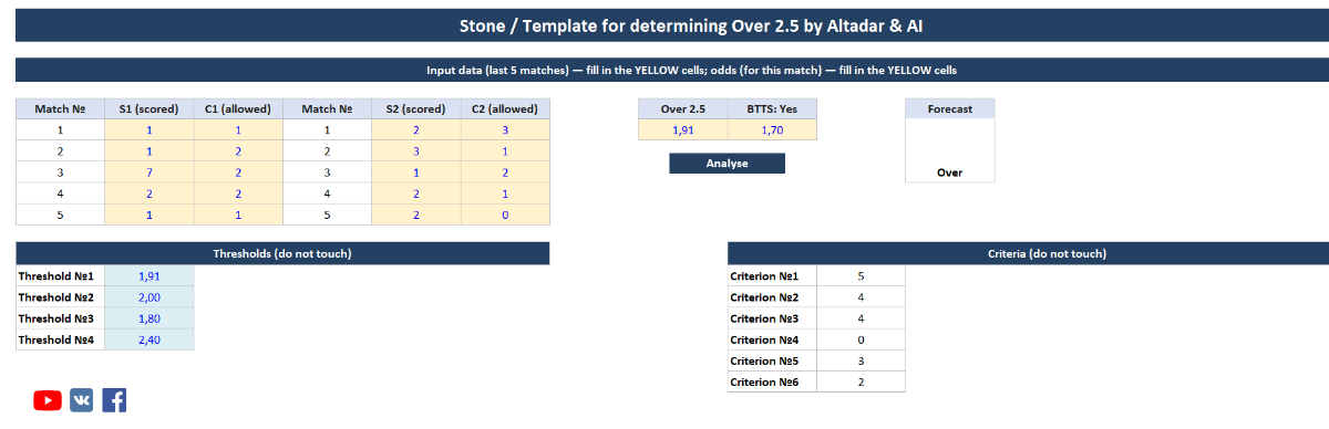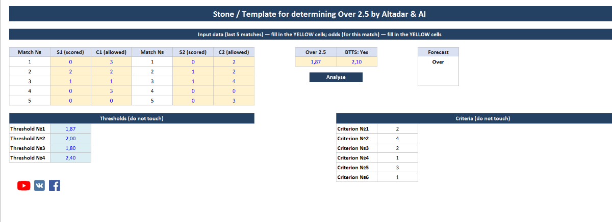 Роман .Пшерадзский 100 Опубликовано 15 декабря, 2025 Поделиться Опубликовано 15 декабря, 2025 14 часов назад, Nazarnineangels сказал: Stone - шаблон из 3 отборов, которые были найдены с помощью нейросети. Проход проверялся на большой истории футбольных матчей и составляет 60-65% со средним коэффициентом 1.75. Инструкция: Нужно ввести по 5 последних матчей обеих команд дома/в гостях, затем коэффициент на ТБ(2.5) и ОЗ: Да, после нажмите «Анализ», если по какому-то критерию подходит матч, то вы увидите «ТБ» в колонке «Подходит?», если матч не подходит, то в этой колонке будет пусто. P.S. Для тех кто хочет проход 100% со средним кф 2, тогда эта тема им не подходит, но те кто понимает что при таких кф с проходом 60-65% это потолок тогда желаю удачи! Stone (RU).xlsb 20.79 kB · 21 загрузка Stone (ENG).xlsb 20.81 kB · 11 загрузок Я так понимаю, 5 последних матчей обеих команд дома/в гостях только чемпионат, без кубков и товарищеских? Цитата Ссылка на комментарий https://brcbet.com/topic/429700-stone-shablon-dlya-opredeleniya-tb25/#findComment-518293 Поделиться на другие сайты Поделиться