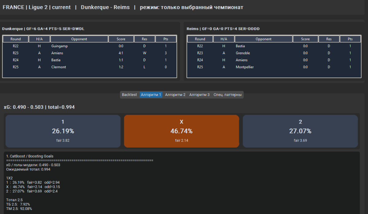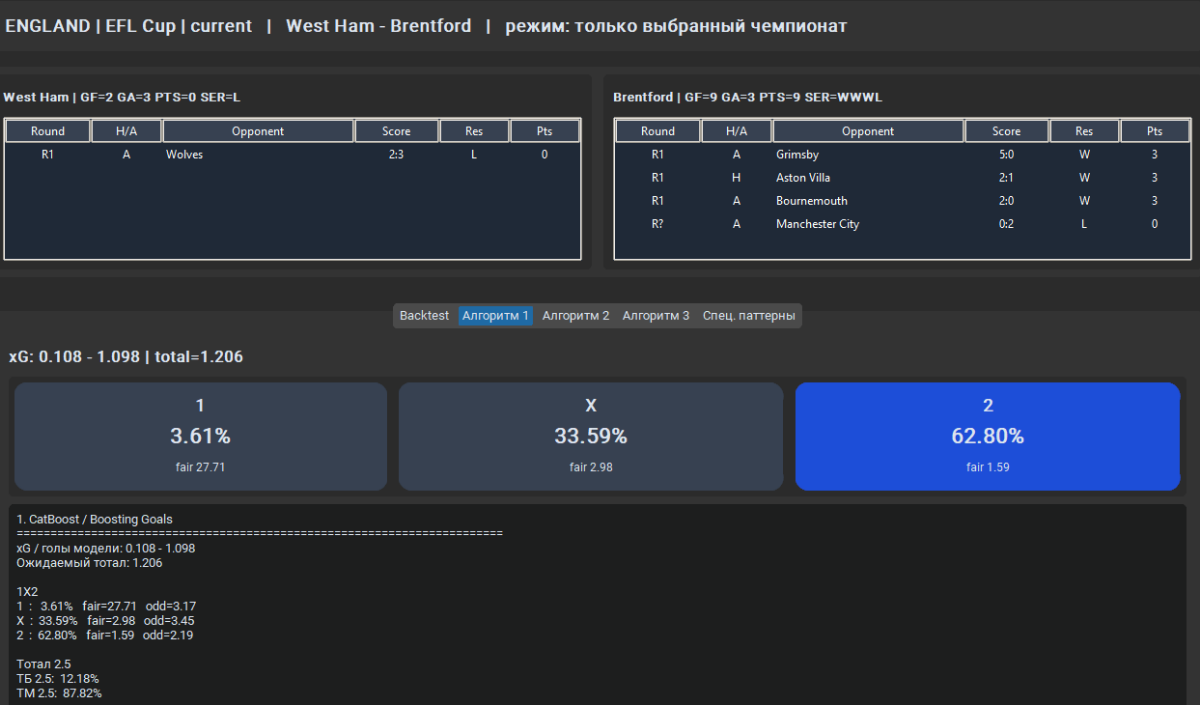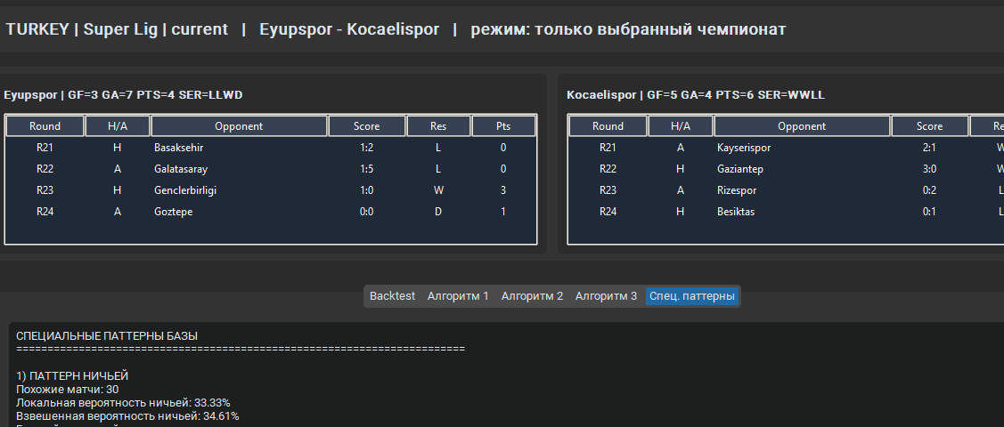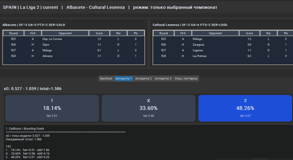 Валерий Иванович 689 Опубликовано 10 марта Поделиться Опубликовано 10 марта (изменено) 9 часов назад, hostmas сказал: А ты что пробовал? У меня Стекинг из трех базовых моделей: XGBoost, LightGBM, CatBoost. Последовательное обучение на ошибках друг у друга, далее создается итоговый стекинг, выполняет обобщение каждого видения моделей (они все разные признаки используют), что дает прирост в точности если брать отдельные результат от каждой модели. Уже добавлял рандомфорест, но думаю вернуть его обратно, для разнообразия. В базе *.db сейчас 11.5к записей о матчах с 128 признаками, начинал с csv. Сейчас добавил 5 новых признаков в базу: Запустил шайтан машину, для парсинга и заполнения этих признаков ))) Надеюсь в flashscore не упадет сегодня ))))) Я честно сказать много чего пробовал с момента первого запуска в августе 25 года, фолды, автоподбор параметров, разные модели, стекинги, вотинги, бустинги, даже нейронку Keras засовывал, но он себя показывает хорошо от 100к записей хорошо, до чего мне далеко. Пару раз обнулял базу, пока не допер что можно парсеры делать на регулярках для добавления данных. Сейчас пока нравятся эти три модели, и стекинг оставил - нормальная тема время показало ))) Отказался от балансировки, инжиниринга и маштабируемости что бы предиктор видел фактические данные, переобучения больше 1% не повышается, иногда в минус вообще уходит - обобщающая способность прекрасна )) Все работает на полном автомате, заполнение базы, удаление токсичных данных из базы, обучение ) Почти год работы, с каждым днем что-нибудь новое в башку зайдет, вот и пилю и пилю постоянно )) Изменено 10 марта пользователем Валерий Иванович 1 Цитата Ссылка на комментарий https://brcbet.com/topic/429738-moe-nachinanie-v-mashinnyh-metodah/page/9/#findComment-522075 Поделиться на другие сайты Поделиться
