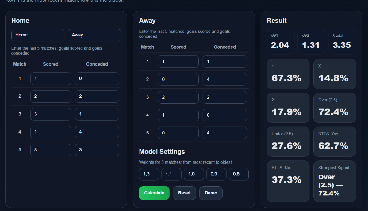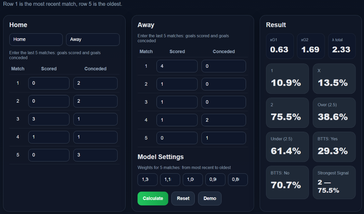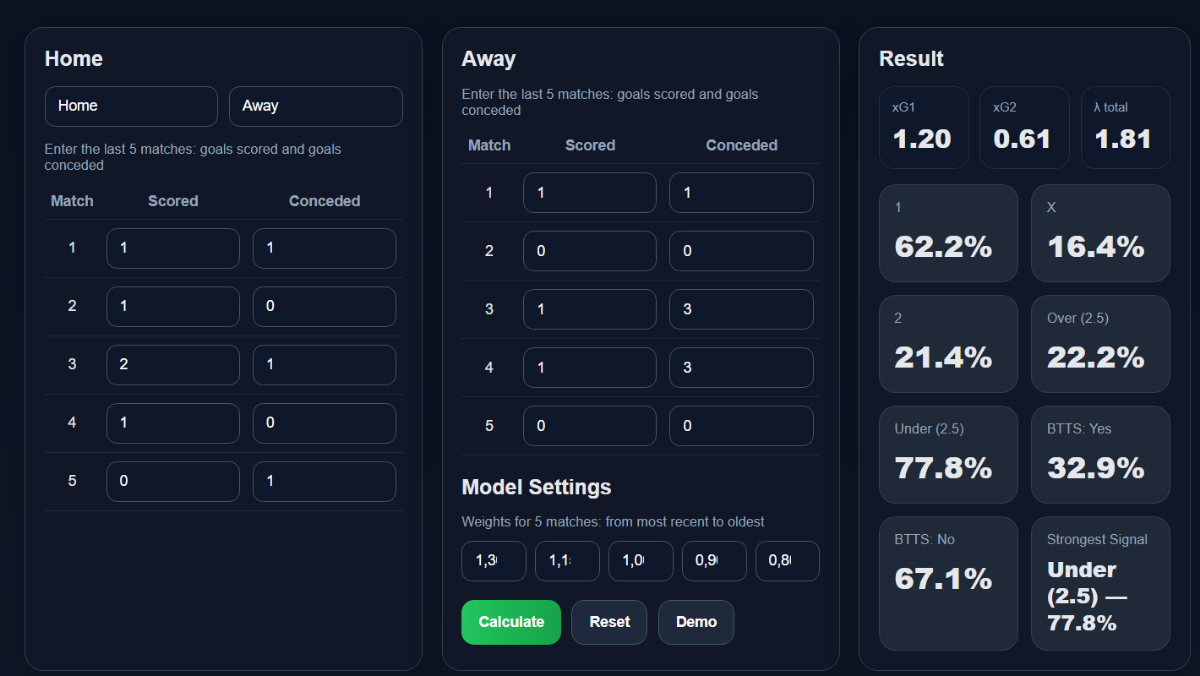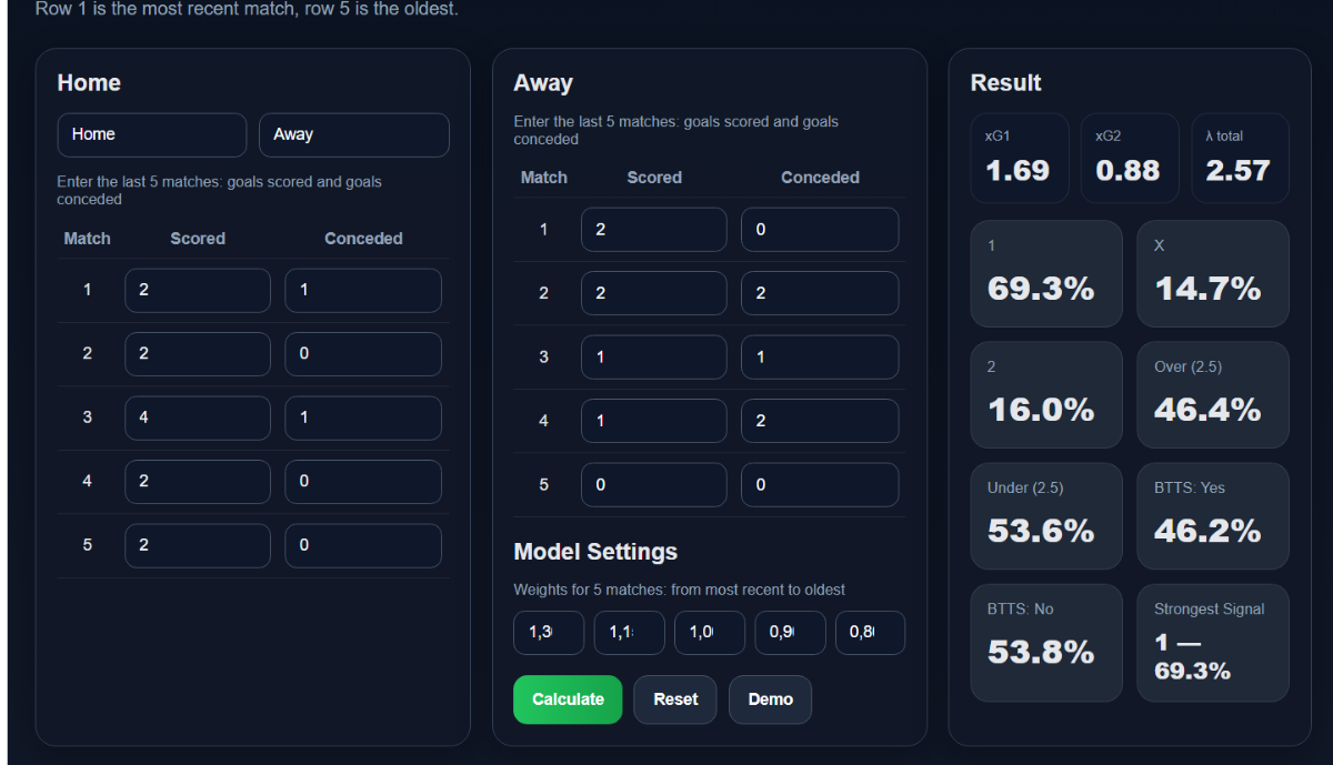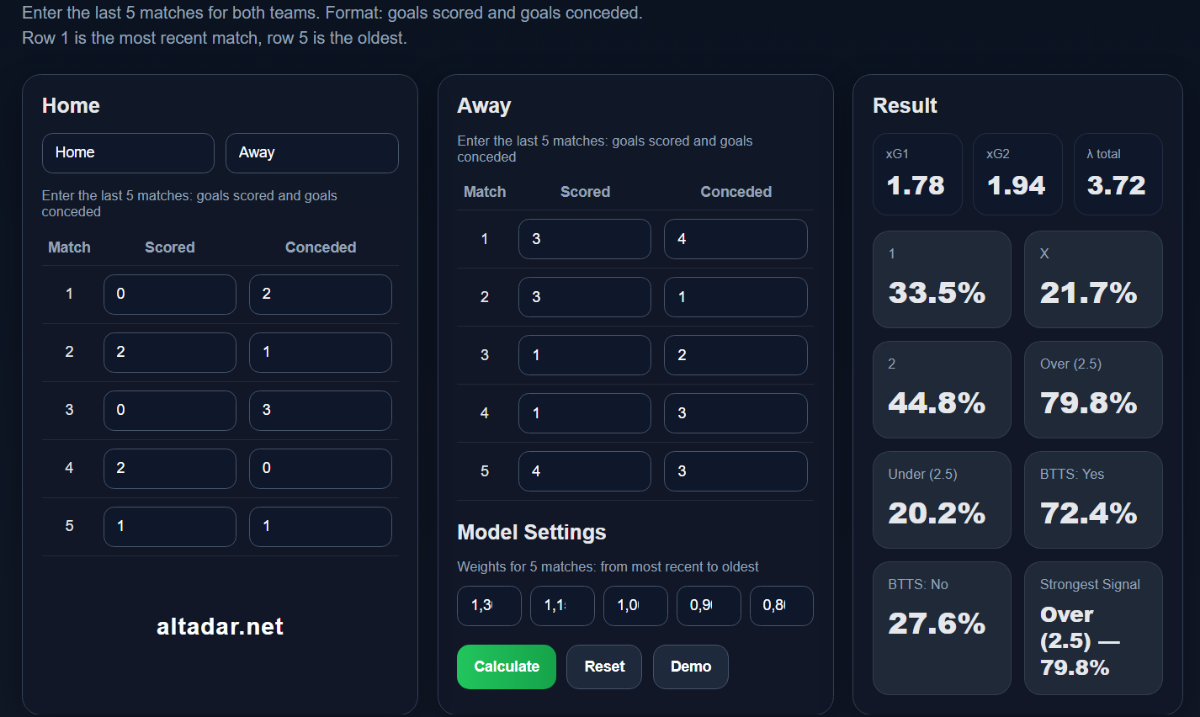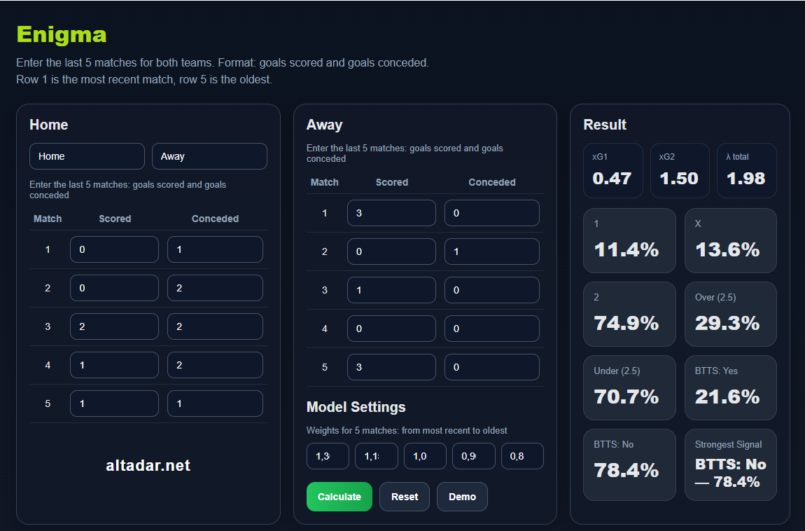Fiksar 309 Опубликовано 12 марта Поделиться Опубликовано 12 марта 15 часов назад, Nazarnineangels сказал: Enigma — модель для анализа футбольных матчей для таких ставок, как 1X2, тоталы, обе забьют. Всё очень просто: нужно ввести последние 5 матчей обеих команд, дальше всё на ваше усмотрение. Также вы можете экспериментировать и вносить свои настройки в модель. Как для меня очень интересная тема. Работает с телефона тоже. https://www.altadar.net/analytics-center/enigma Спасибо огромное Назар! 2 Цитата Ссылка на комментарий https://brcbet.com/topic/429757-enigma/#findComment-522253 Поделиться на другие сайты Поделиться