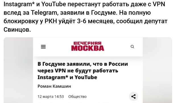 sdf 59 Опубликовано 12 марта Поделиться Опубликовано 12 марта (изменено) Фейк, технически возможно, если отрежут трансмагистраль и сделают чебурнет по типу как в Северной Корее. В реалиях невозможно, тк бизнесу сразу придут кранты, население сильно будет негодовать. Хаос, неразбериха, мелкие бунты, поэтому для тех, кто смотрит телевизор - "отключат", для остальных будет работать Изменено 12 марта пользователем sdf 2 Цитата Ссылка на комментарий https://brcbet.com/topic/429758-blokirovka-messendzherov/#findComment-522276 Поделиться на другие сайты Поделиться