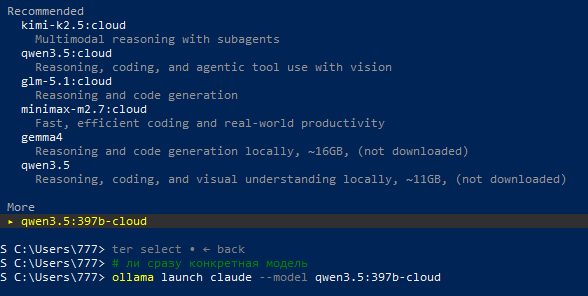 а в облаке вы получаете всю мощь самой мощной модели qwen3.5:397b-cloud это то что нужно