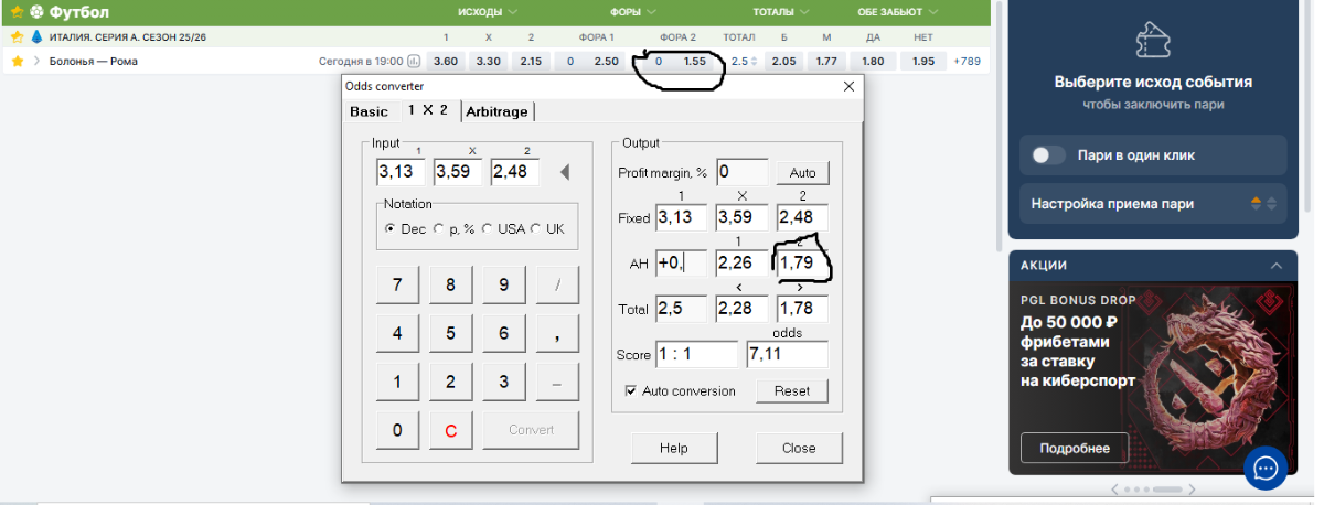 kelbr 112 Опубликовано 1 час назад Поделиться Опубликовано 1 час назад вот как пример | Рынок | Исход | Коэффициент | | :------------------: | :-----------------------: | :---------: | | **1X2** | Хозяева | 3.22 | | | Ничья | 3.51 | | | Гости | 2.47 | | **Двойной шанс** | Хозяева не проиграют (1X) | 1.68 | | | Ничьей не будет (12) | 1.40 | | | Гости не проиграют (X2) | 1.45 | | **Тотал** | Больше 0.5 | 1.09 | | | Меньше 0.5 | 12.73 | | | Больше 1 | 1.11 | | | Меньше 1 | 9.96 | | | Больше 1.5 | 1.42 | | | Меньше 1.5 | 3.37 | | | Больше 2 | 1.69 | | | Меньше 2 | 2.44 | | | Больше 2.5 | 2.34 | | | Меньше 2.5 | 1.74 | | | Больше 3 | 3.78 | | | Меньше 3 | 1.36 | | | Больше 3.5 | 4.85 | | | Меньше 3.5 | 1.26 | | | Больше 4 | 10.84 | | | Меньше 4 | 1.10 | | | Больше 4.5 | 12.39 | | | Меньше 4.5 | 1.09 | | **Фора (Азиатская)** | Хозяева +1.5 | 1.20 | | | Гости -1.5 | 5.89 | | | Хозяева +1 | 1.29 | | | Гости -1 | 4.50 | | | Хозяева 0 (DNB) | 2.31 | | | Гости 0 (DNB) | 1.77 | | | Хозяева -1 | 7.06 | | | Гости +1 | 1.16 | | | Хозяева -1.5 | 8.79 | | | Гости +1.5 | 1.13 | | **Обе забьют** | Да | 1.94 | | | Нет | 2.06 | | **ИТ Хозяева** | Больше 0.5 | 1.45 | | | Меньше 0.5 | 3.20 | | | Больше 1 | 2.05 | | | Меньше 1 | 1.95 | | | Больше 1.5 | 3.36 | | | Меньше 1.5 | 1.42 | | | Больше 2 | 8.90 | | | Меньше 2 | 1.13 | | | Больше 2.5 | 11.25 | | | Меньше 2.5 | 1.10 | | | Больше 3 | 48.66 | | | Меньше 3 | 1.02 | | | Больше 3.5 | 52.31 | | | Меньше 3.5 | 1.02 | | | Больше 4 | 313.86 | | | Меньше 4 | 1.00 | | | Больше 4.5 | 318.96 | | | Меньше 4.5 | 1.00 | | **ИТ Гости** | Больше 0.5 | 1.34 | | | Меньше 0.5 | 3.98 | | | Больше 1 | 1.69 | | | Меньше 1 | 2.45 | | | Больше 1.5 | 2.74 | | | Меньше 1.5 | 1.58 | | | Больше 2 | 6.07 | | | Меньше 2 | 1.20 | | | Больше 2.5 | 7.98 | | | Меньше 2.5 | 1.14 | | | Больше 3 | 29.11 | | | Меньше 3 | 1.04 | | | Больше 3.5 | 32.14 | | | Меньше 3.5 | 1.03 | | | Больше 4 | 165.36 | | | Меньше 4 | 1.01 | | | Больше 4.5 | 169.64 | | | Меньше 4.5 | 1.01 | Цитата Ссылка на комментарий https://brcbet.com/topic/429766-moya-proga-mozhet-komu-prigoditsya/page/17/#findComment-525018 Поделиться на другие сайты Поделиться