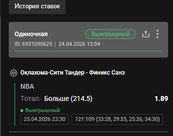 Постоянный good_bye 646 Опубликовано 4 часа назад Автор Постоянный Поделиться Опубликовано 4 часа назад 5 минут назад, OlegZ сказал: Нет. Статистика может конечно и врать, но в основном нет. Твоя ошибка в том, что ты не следишь за лигой и не смотришь матчи. И твой этот вывод основан только на общих данных начальных матчей плей-ин и плей-офф. Которые -ДА все шли на ТМ. Но в плей-ин встречались команды равного уровня и цена ошибки была не попадание в плей-офф. Естественно была усилена защита и снижен тэмп игры. Так бывает всегда при финальных матчах на вылет. Касательно этого матча Финикс-Оклахома. Встречаются разные по уровню команды. В первой встрече Оклахома присматривалась к своему сопернику и отсюда первая игра пришлась на ТМ. Но как лидер понял, что проблем у него не возникнет с этой командой стал играть раскованно и отсюда и результат во второй встрече -ТБ. А с третьей встречей было уже понятно, Финикс понимает что Оклахома ему не по зубам и матч проходил в спокойной обстановке и все играли в свое удовольствие. Отсюда и ТБ. Дата Хозяева Гости Линия Poss_Signal Old_Signal Тест1 FINAL_Signal Confidence Risk_Flag Факт_Тотал Факт_Результат Poss_Status Old_Status FINAL_Status 19.04.26 Оклахома Финикс 214,5 ТБ ТБ ТБ ТБ 91 203 ТМ LOSS LOSS LOSS 23.04.26 Оклахома Финикс 213,5 ТБ ТБ ТБ ТБ 100 227 ТБ WIN WIN WIN 25.04.26 Финикс Оклахома 215 ТБ ТБ ТБ ТБ 68 230 ТБ WIN WIN WIN ну кстати консенсус был на +11 сыграли на +16 от линии )) так что алгоритм не плох Цитата Ссылка на комментарий https://brcbet.com/topic/429771-basket_stat/page/2/#findComment-525065 Поделиться на другие сайты Поделиться