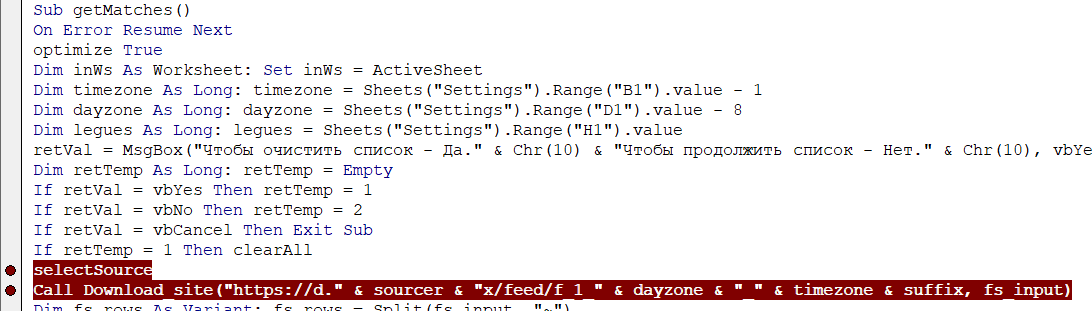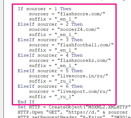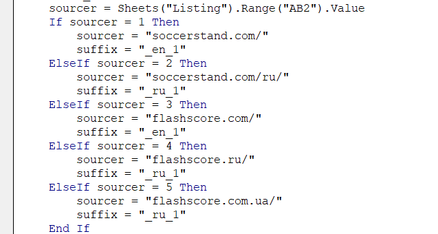 Dorian 153 Опубликовано 20 февраля Поделиться Опубликовано 20 февраля 13 минут назад, Валерий Иванович сказал: Можете сделать проще: Присвоить публичность ресурсу и суффиксу таким способом: Public sourcer As String, suffix As String Написать такой список, с вызовом из нужной вам ячейки: Sub selectSource() sourcer = Sheets("Settings").Range("F1").value Select Case sourcer Case 1: sourcer = "livescore.in/": suffix = "_en_1" Case 2: sourcer = "livescore.in/ru/": suffix = "_ru_1" Case 3: sourcer = "livesport.com/": suffix = "_en_1" Case 4: sourcer = "livesport.com/ru/": suffix = "_ru_1" Case 5: sourcer = "soccer24.com/": suffix = "_en_1" Case 6: sourcer = "soccer24.com/ru/": suffix = "_ru_1" Case 7: sourcer = "flashscore.com/": suffix = "_en_1" Case 8: sourcer = "flashscorekz.com/": suffix = "_ru-kz_1" Case 9: sourcer = "flashfootball.com/": suffix = "_en_1" End Select End Sub В нужном вам макросе вызвать selectSource таким способом: Это избавит вас от головной боли, при поиске подобных кусков кода в разнообразных макросах: Вам тоже спасибо за подсказку, но я не понял ничего. Только не бейте ногами. В программировании я - 0 без палочки, поэтому задам пару вопросов: 1. Где это писать, то что вы выделили коричневым? 2. Надо дописать suffix в адресах ресурсов загрузки матчей и то, что вы выделили коричневым и тогда в выпадающем меню появятся эти сайты и можно будет с них загружать матчи? Цитата Ссылка на комментарий https://brcbet.com/topic/68703-remont-tablits/page/131/#findComment-500595 Поделиться на другие сайты Поделиться