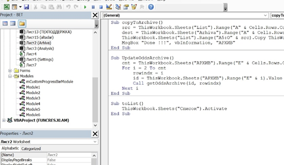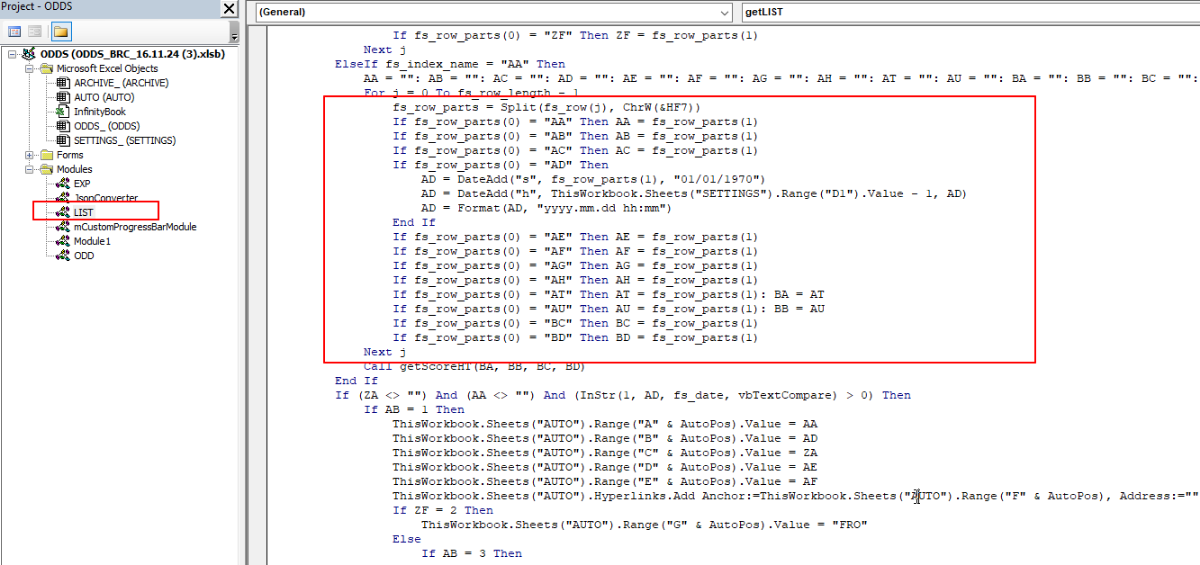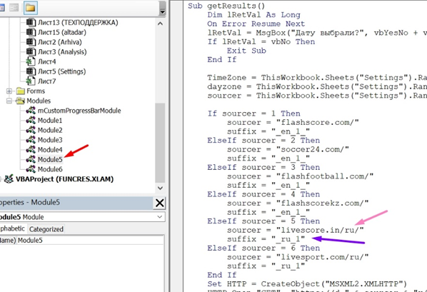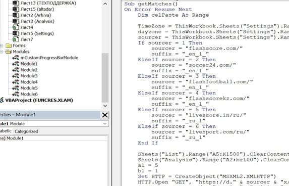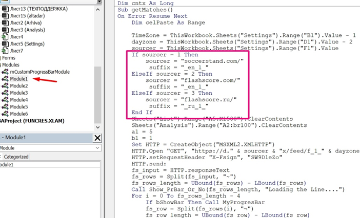 Fiksar 267 Опубликовано 20 февраля Поделиться Опубликовано 20 февраля 4 часа назад, kovan сказал: Как я делаю: 1 открыл файл, нажал alt+f11 ➔ вошли в VB 2 Щёлкаем по модулю 5, в этой программе там больший (не урезанный) список. Тут 6 сайтов, 3 нижних с русским языком. Стрелками показано, где название сайта и расклад яз. Если всё устраивает, то копируем весь участок выбора: от “IF source” до “End If”. Переходим в Module 1 Видим такой же блок, но с тремя сайтами (как видишь один русский сайт есть, только он не рабочий и ссылка ведёт на flashscorekz.com). Выделяем блок и заменяем скопированным в 5-ом модуле. В 6-ом модуле тоже есть такой список, но он такой же как в 5-ом, если не менял список, то ничего не трогаем, а если что-то сменил, то и там меняй. Далее переходим на саму программу и тыкаем на любой лист правой кнопкой мышки, в списке выбираем «показать» Находим «Settings» ➔ «ОК», откроется лист «Settings» и там список сайтов: (в колонке F указан какой сайт выбран из списка) Меняем список: Шлёпаем по названию (вернее по ячейке E1) текст появится в строке формул Текст меняем именно в строке формул на первый сайт в списке, он у нас: flashscore.com, Я запишу без расширения Что там напишем ни на что не влияет, лишь бы самому понятно было. Меняем так все 6 строк Переходим в лист «List», топаем правой кнопкой мышки по окошку выбора сайта Меняем на шестёрки (количество строк с сайтами) Заходим в архив и там также меняем: Всё! Можешь называть себя Хакером Спасибо! Цитата Ссылка на комментарий https://brcbet.com/topic/68703-remont-tablits/page/131/#findComment-500600 Поделиться на другие сайты Поделиться