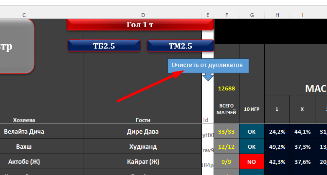 kovan 1 508 Опубликовано 24 июня Поделиться Опубликовано 24 июня (изменено) 3 часа назад, LegiON сказал: Спасибо что поправил, видимо слишком торопился и не углядел. Впрочем,я не профи в этом деле и даже не новичок, так что простите, если что не так. Я тоже далекооо не профи, начинающий любитель на уровне начальной школы, просто заинтересовал процесс, стал пробовать. Вчера не спалось, вот и посмотрел, нашёл огрехи в твоём обновлении.. вот и всё, код не менял. Надо бы серьёзно все макросы прочистить, но ЛЕТО - куча дел, некогда с компом сидеть Кстати, в архиве прилепил кнопку для очистки от дупликатов матчей, бывают часто когда списки нахлёстваются по времени. Нажимайте на неё после того как запишите новые данные в архив. Можно сразу не удалять, программа отметит повторы красным цветом, если всё верно, можно ещё раз запустить проверку и нажать "ок". Изменено 24 июня пользователем kovan Цитата Ссылка на комментарий https://brcbet.com/topic/68703-remont-tablits/page/168/#findComment-508454 Поделиться на другие сайты Поделиться