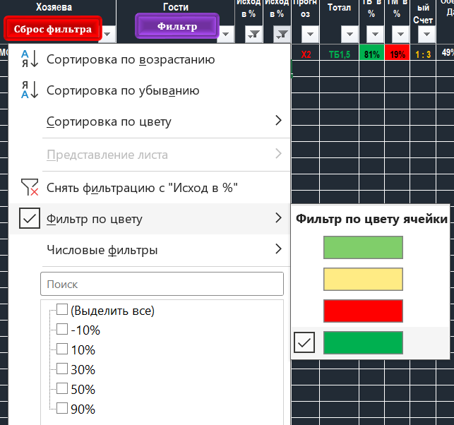 daszzai 22 Опубликовано 10 ноября Поделиться Опубликовано 10 ноября 18 минут назад, kovan сказал: А в чём проблема? Жмёшь "фильтр", потом в настройке фильтра столбца можно выбрать, например по цвету. Ярко красные - это минимальный процент, "зелёные" - максимальный Может я что-то не так понял, но ведь первый фильтр ориантирован на домашнюю команду и считает забитые голы команды, а второй фильтр сколько команда пропускает? Тогда просто сделав процент на втором фильтре выше, а на первом ниже (или как вы сказали по цветам) то это не верный отбор будет, как если бы мы оставили больший процент на первом фильтре, а меньший на втором. Надеюсь понятно написал... Цитата Ссылка на комментарий https://brcbet.com/topic/68703-remont-tablits/page/175/#findComment-515863 Поделиться на другие сайты Поделиться