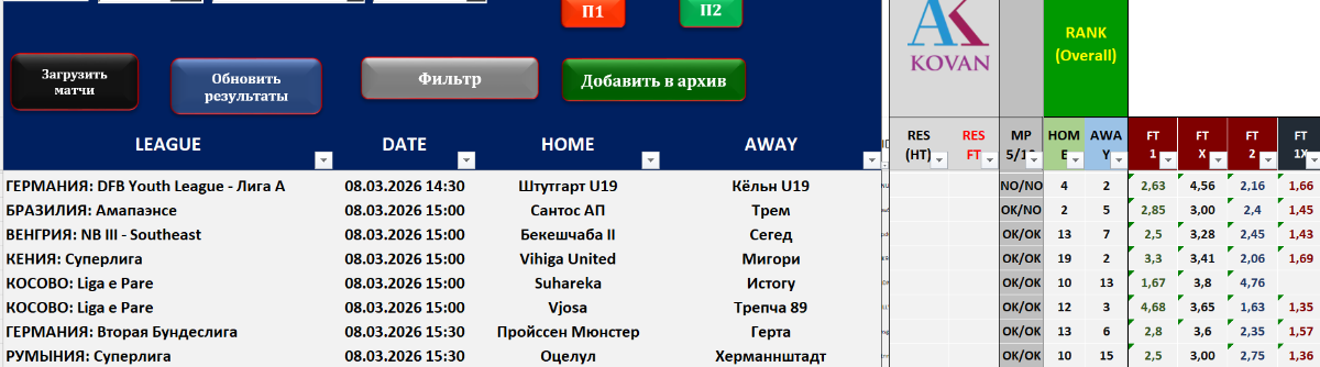 sdf 59 Опубликовано 2 марта Поделиться Опубликовано 2 марта В 01.03.2026 в 02:58, kovan сказал: Нашёл турецкую програмку, из спортивного интереса, разблокировал, русифицировал, исправил формулы на странице Accueil. Программа явно слеплена из 2-х или более программ. Архив совсем не из этой песни, да и вообще спрятан. Может кому интересна будет KERONOVA V12 KA.xlsm 1.96 MB · 39 загрузок Неплохая прога, чтобы в обратку ставить. Пару матчей брал сегодня Персита итб1.5 Вулверхэмптон u21 итб 1.5 Прога давала наоборот Оба щас зашли, надо дальше смотреть 2 Цитата Ссылка на комментарий https://brcbet.com/topic/68703-remont-tablits/page/187/#findComment-521570 Поделиться на другие сайты Поделиться