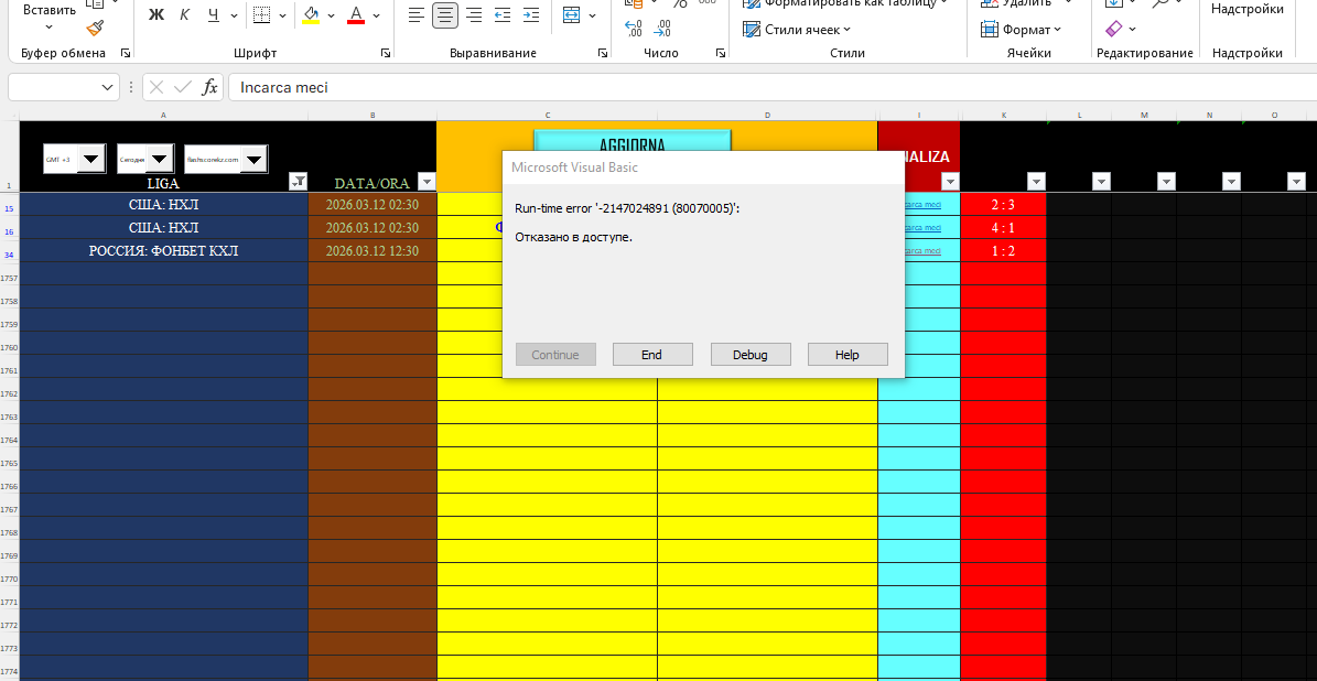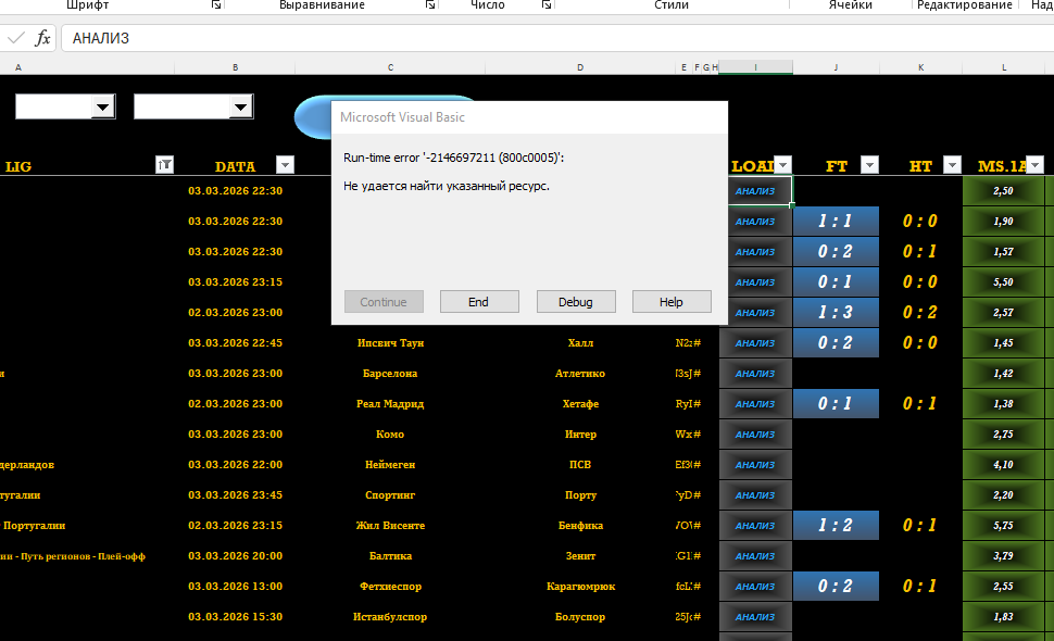 onyxbk 6 Опубликовано 12 марта Поделиться Опубликовано 12 марта 4 часа назад, kovan сказал: il.antonoff попросил оживить программу HOCKEY FORMULA vs POISSON, но когда я попросил прислать прогу он исчез из переписки. Нашёл в телеграмме, но образца 2024года, не знаю были-ли помоложе. Короче, вот она, может ещё кому интерсна: HOCKEY FORMULA vs POISSON.xlsm 1007.65 kB · 13 загрузок выдает такую ошибку после нажимаю на дебаг и выходит это в чем может быть проблема? Цитата Ссылка на комментарий https://brcbet.com/topic/68703-remont-tablits/page/187/#findComment-522244 Поделиться на другие сайты Поделиться