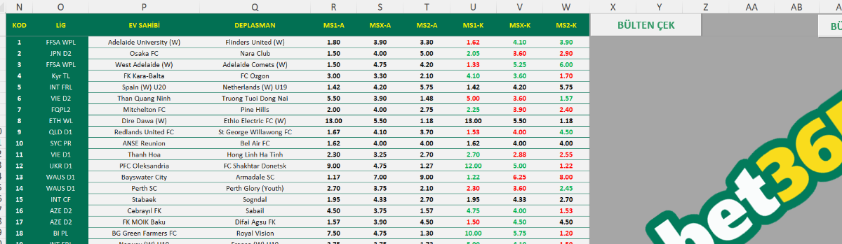Xizir 204 Опубликовано 6 марта Поделиться Опубликовано 6 марта 3 часа назад, kovan сказал: Чуть поправил, читает таблицу теперь не с nowgoal, а с 888scoreonline.net Что-бы кф отображались корректно, нужно что-бы в EXCEL-е был установлен разделитель "точка" (.) 1. MOA v1.5 (Bet365).xlsm 24.81 MB · 4 загрузки Спасибо за труд 1 Цитата Ссылка на комментарий https://brcbet.com/topic/68703-remont-tablits/page/187/#findComment-521809 Поделиться на другие сайты Поделиться